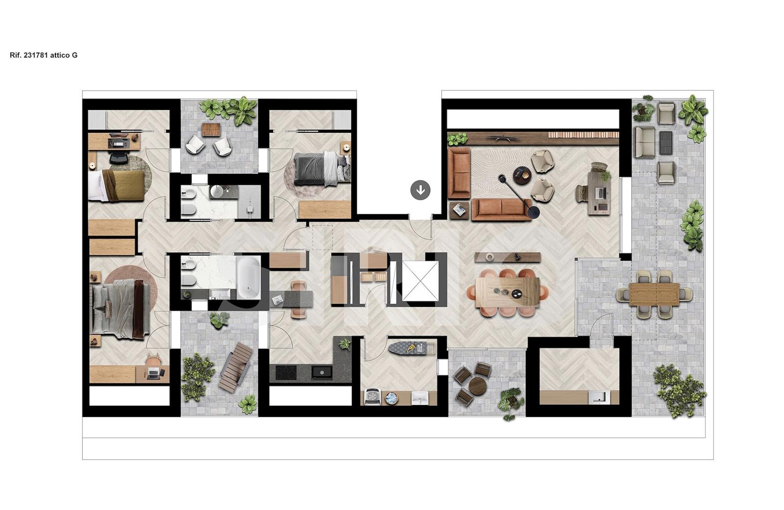 Esclusivo attico tricamere, residenza unica e raffinata, pensata per chi desidera eleganza, comfort e ricercatezza in un contesto residenziale moderno e di pregio, poco distante dal centro di Codroipo. L’abitazione è inserita all’interno di un nuovo complesso in fase di realizzazione, circondato da palazzine di recente costruzione, con consegna prevista nel 2027 e realizzato secondo tecnologie costruttive d’avanguardia. Servito da ascensore con accesso diretto all’interno dell’appartamento, l’attico accoglie uno splendido soggiorno open space di 54 mq con zona pranzo, caratterizzato da ampie superfici vetrate e affaccio sull’ampio terrazzo di 45 mq, tutto da vivere. La zona giorno è completata da cucina, ripostiglio e una comoda lavanderia. La zona notte si sviluppa con tre camere da letto, tutte affacciate su ulteriori due terrazzi, e due bagni dal design moderno. L’abitazione, progettata per garantire la massima classe energetica, offre elevati standard di comfort, efficienza e qualità abitativa. L’architettura moderna e ricercata, unita alla possibilità di personalizzare la distribuzione interna e le finiture, rende questa proposta una vera rarità sul mercato: una residenza esclusiva, elegante e contemporanea, ideale per chi desidera distinguersi e vivere in uno spazio pensato per stupire e accogliere. Una proposta unica, per chi cerca il meglio. Possibilità di acquisto di cantina e posti auto. Rif. 231781
